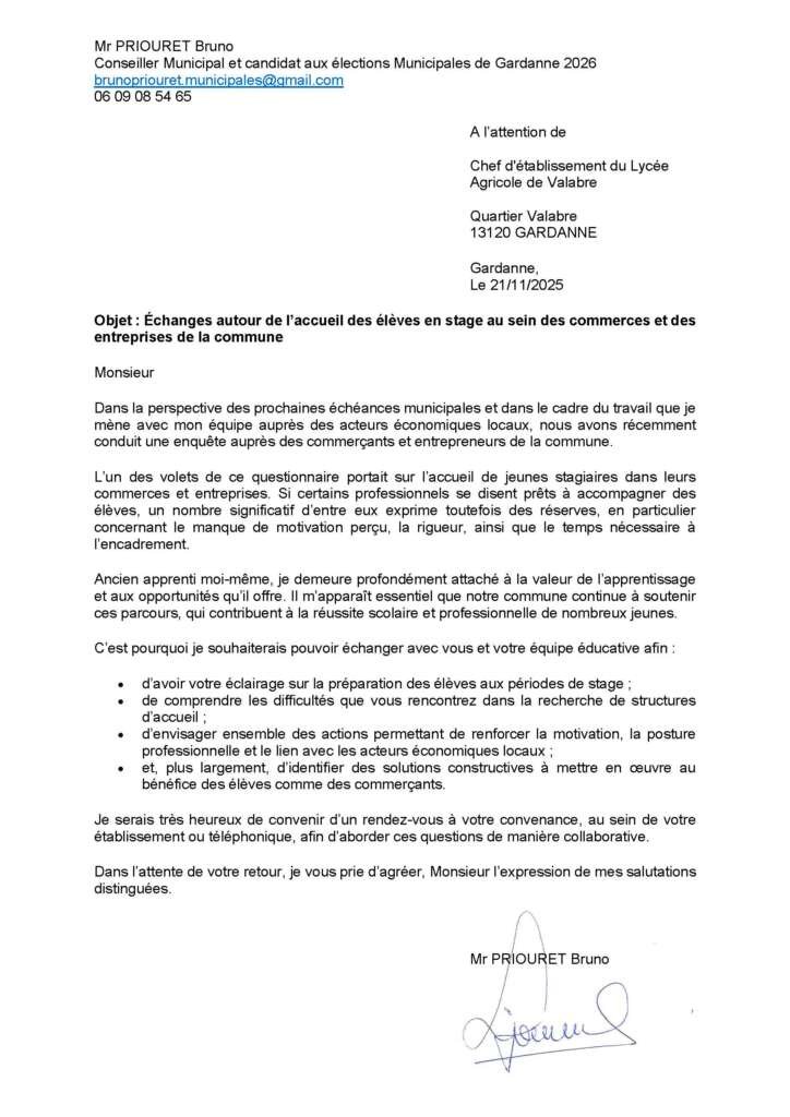 L'objectif final est de faire de Gardanne un modèle où le Lycée et les commerces travaillent main dans la main. Nous serions très heureux de convenir d'un rendez-vous pour aborder ces questions de manière collaborative. Ce projet vise à créer un réseau structuré facilitant stages et **apprentissage des jeunes à Gardanne**, pour une meilleure insertion professionnelle.