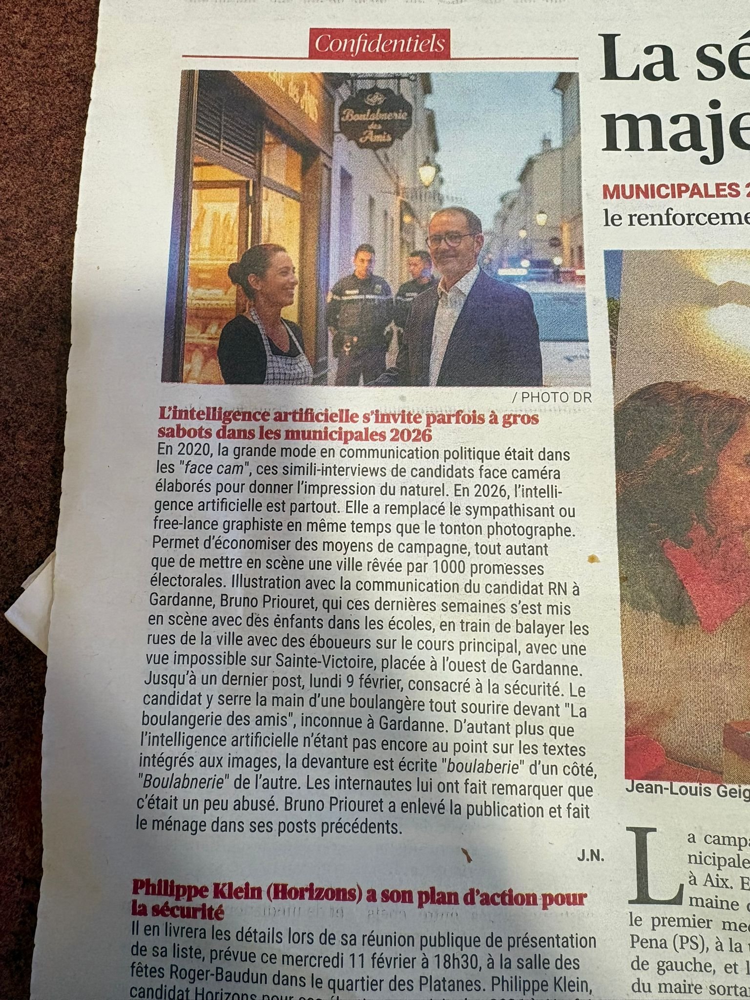 Le 11 février, La Provence a relevé une bourde dans notre communication de campagne : une enseigne de boulangerie générée par intelligence artificielle, avec « Boulaberie » d'un côté et « Boulabnerie » de l'autre. On ne va pas tourner autour du pot : c'est une erreur de notre part, on aurait dû relire avant de publier. C'est corrigé.